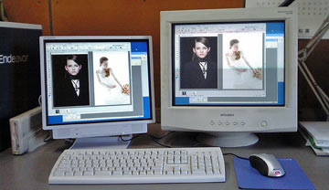 しかし、右の写真を見れば一目瞭然なのだが、左側のLCDに映ってる女の子の黒い服と背景の黒の区別がつかなくなってしまっているのがわかるだろう。右のCRTではそのような事はなく容易に区別がつくのだから、やはりLCDが写真のレタッチに向いていないというのは本当なのだろう。同じように白い服の女性も背景と区別がつかなくなっている。