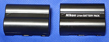上下の写真で左側がオークションゲットのバチモノで右側がD100に付属していたバッテリだ。表面に「Nikon Li-ion BATTERY PACK」の文字がないのはすぐ判ったが、裏面も微妙に違う。