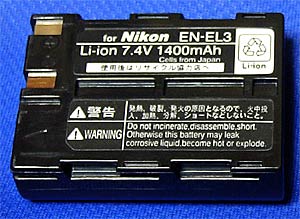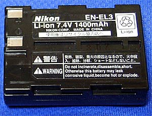 D100は専用のリチウム・イオン(Li-ion)の充電池を使用する。Li-ionは継ぎ足し充電が可能で小型軽量であることから、デジカメの電源に適しているが、メーカー・機種により専用の場合が多い。