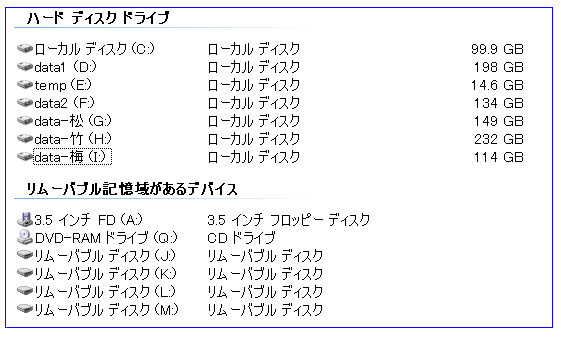 バックアップもせずそのまま移し替えたけだから、以前のデータはそのまま残っている。(data松、竹、梅がHDDケースにあるドライブだ) パソコンの電源オン/オフに連動するので、手間がかからないし、USBだから必要な時に電源を入れても途中で切っても構わない。 案外使い勝手は良いようだ。 と、思ったのだが……