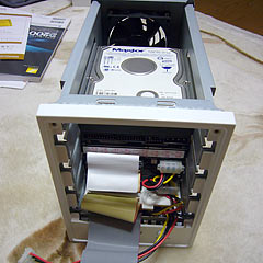 組み込みは簡単だった。既存2台の外装をばらして裸のHDDを取り出し、HDDケースにねじ止めしてコネクタを差し込むだけである。