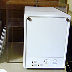 HDDケースの内部。後部には冷却ファンがある。黒色ボディが欲しかったが在庫なしだった。