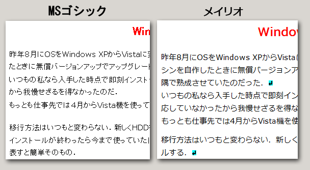 例のように『メイリオ』と『MSゴシック』では文字の大きさや間隔が随分違うから、レイアウトも狂ってしまうことになる。