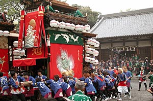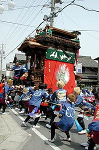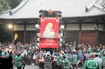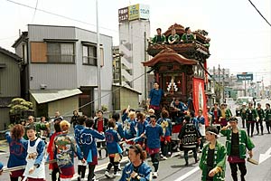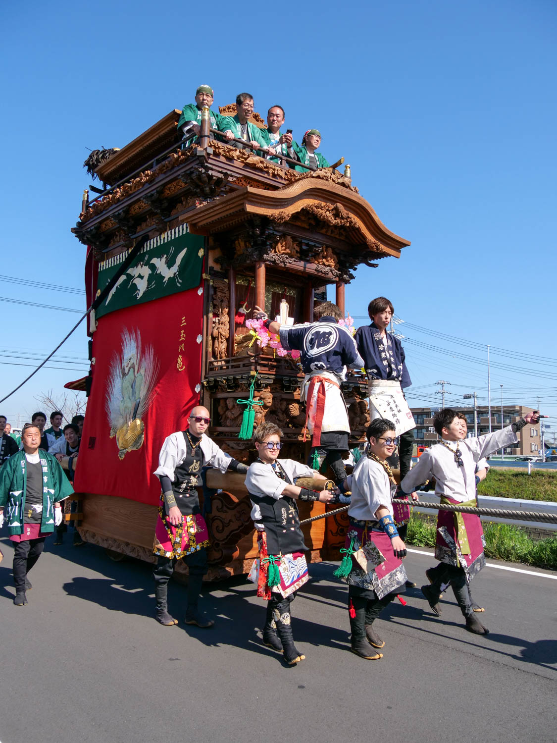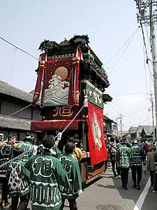 この旭車は、弘化3年(1846)上半田北組にて唐子車として建造され、大正12年(1923)東組に譲渡されたもので、改造の際に立川昌敬作の檀箱や脇障子の彫刻を外し武豊町長尾部の玉貫組に売却したといわれます。 代表彫刻は立川和四郎富昌による檀箱「唐子と鶏」と脇障子「鉄拐仙人・蟇仙人」です。