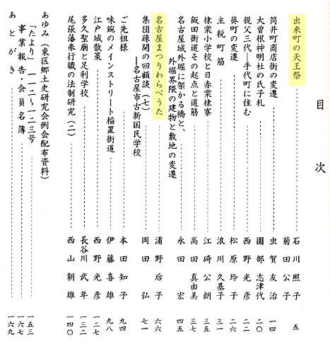 本来は同会会員への配布用として発行される本ですが、目次(下段参照)にもあるように「出来町天王祭」、「名古屋まつりわらべうた」など「尾張の山車まつり」をご覧の方々(特に名古屋系)にも興味ある内容となっています.また、由緒ある東区の歴史を訪ねてみようという方にも格好の本かと思われます。