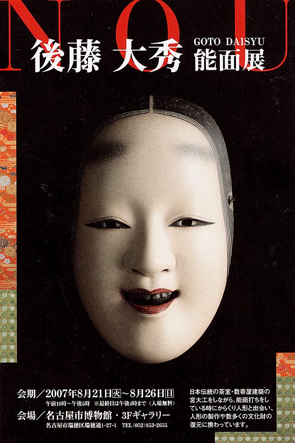 名古屋市中川区戸田の山車からくりや東区「神皇車」、中村区「二福神車」の山車からくりの復元修復を手掛けた後藤大秀師の「能面展」が名古屋市博物館にて開催されます。