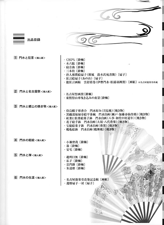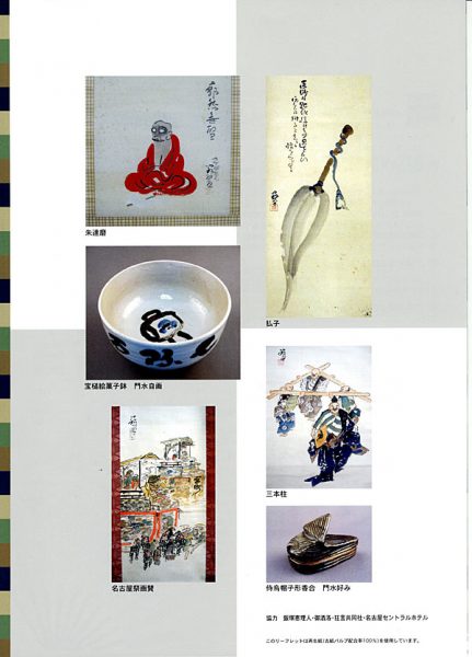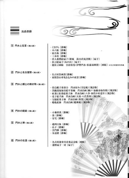 今回の展示は、「門水と狂言」、「門水と名古屋祭」、「門水と郷土の焼き物」、「門水の能絵」、「門水と禅」、「門水の生涯」と6つのコーナーに区切り作品を展示します。