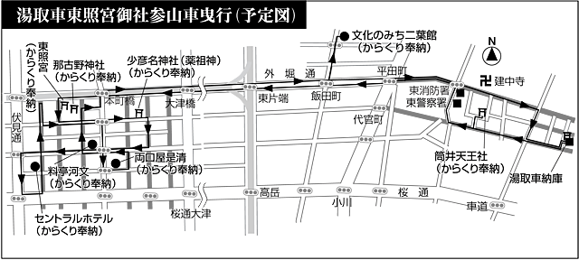 当日雨天の場合中止となりますが、最終決定は9時30分の段階で山車が曳行出来ない場合といたします。なお、この場合通過予定時刻が変更となります。