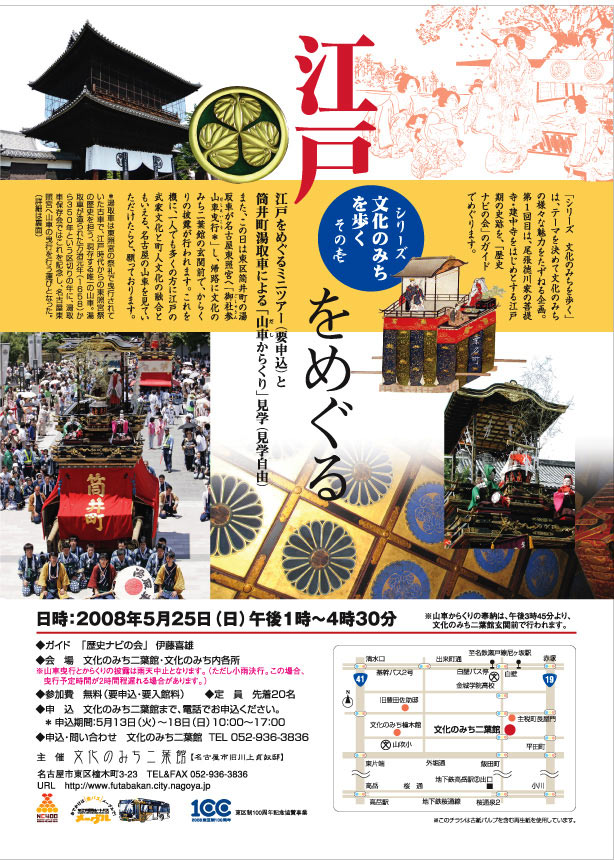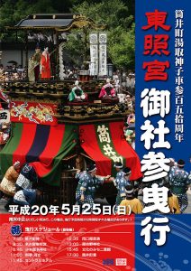 今年、平成20年(2008)は、筒井町の湯取車が造られた万治元年(1658)から丁度350年の区切りの年で、当保存会では、これを記念し、平成20年5月25日(日)に名古屋東照宮への「御社参山車曳行」をする運びとなりました。