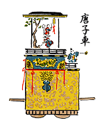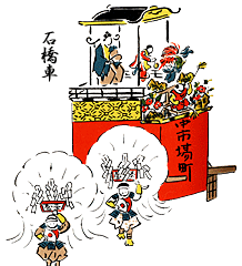 中市場町から出す石橋車のからくり人形は、明和5年に、名人の誉れ高い、竹田藤吉が一度修復し、見違えるようになったそうです。このからくりは、毬を持った唐子人形に獅子が戯れかかる仕掛けになっていますが、獅子人形の重さが、40キロ以上もあるので、三人がかりで、操作したと言われています。左右に岩と牡丹の作り物を飾り、大将は曲禄(法会の際、使用する椅子。背もたれが丸く曲げてあり、四脚は前後を交差させて作り、折り畳めるもの)に座って団扇(軍配)のうちわを持ち、一人の童子は毬を手にして右往左往し、この時獅子は勢い狂い戯れるという趣向のからくりです。