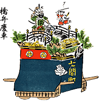 本町の猩々車は、上山の2体の猩々人形が、酒を呑む仕草をするものです。二人の猩々すなわち大酒飲み(中国で想像上の動物。顔の形は人間に似て毛は赤褐色で長く酒を好む)を配置して、前に大瓶が据えてあります。