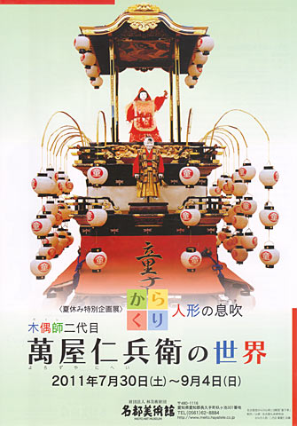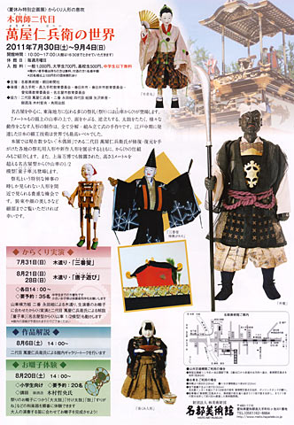 本展では現在数少ない「木偶師(でくし)」である二代目 萬屋仁兵衛氏が修復・復元を手がけた各地の祭礼用人形や新作人形を展示するとともに、からくりの仕組みもご紹介します。また、上海万博でも披露された、高さ3メートルを超える名古屋型からくり山車の1/2模型「童子車(どうじしゃ)」も登場します。