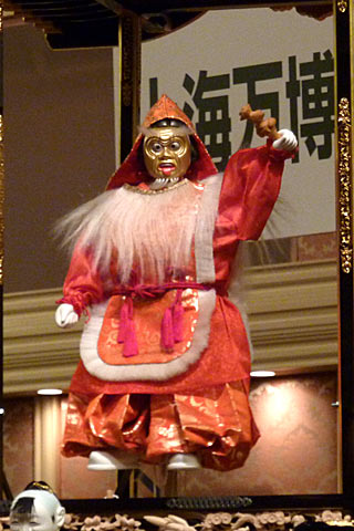 いわゆる面被りの変身からくりで、舞楽の蘇莫者(そまくしゃ)を題材にしたものです。全長63Cm